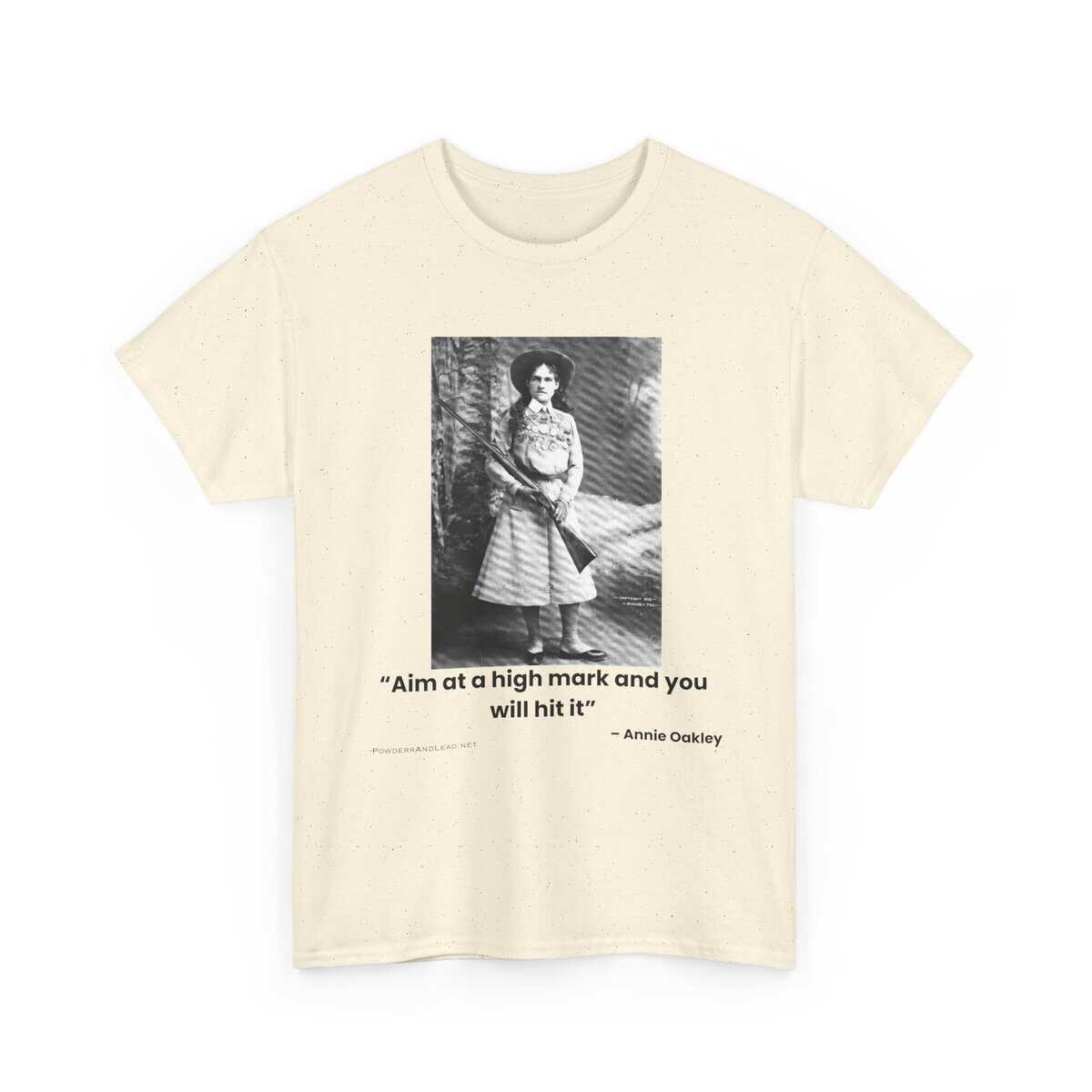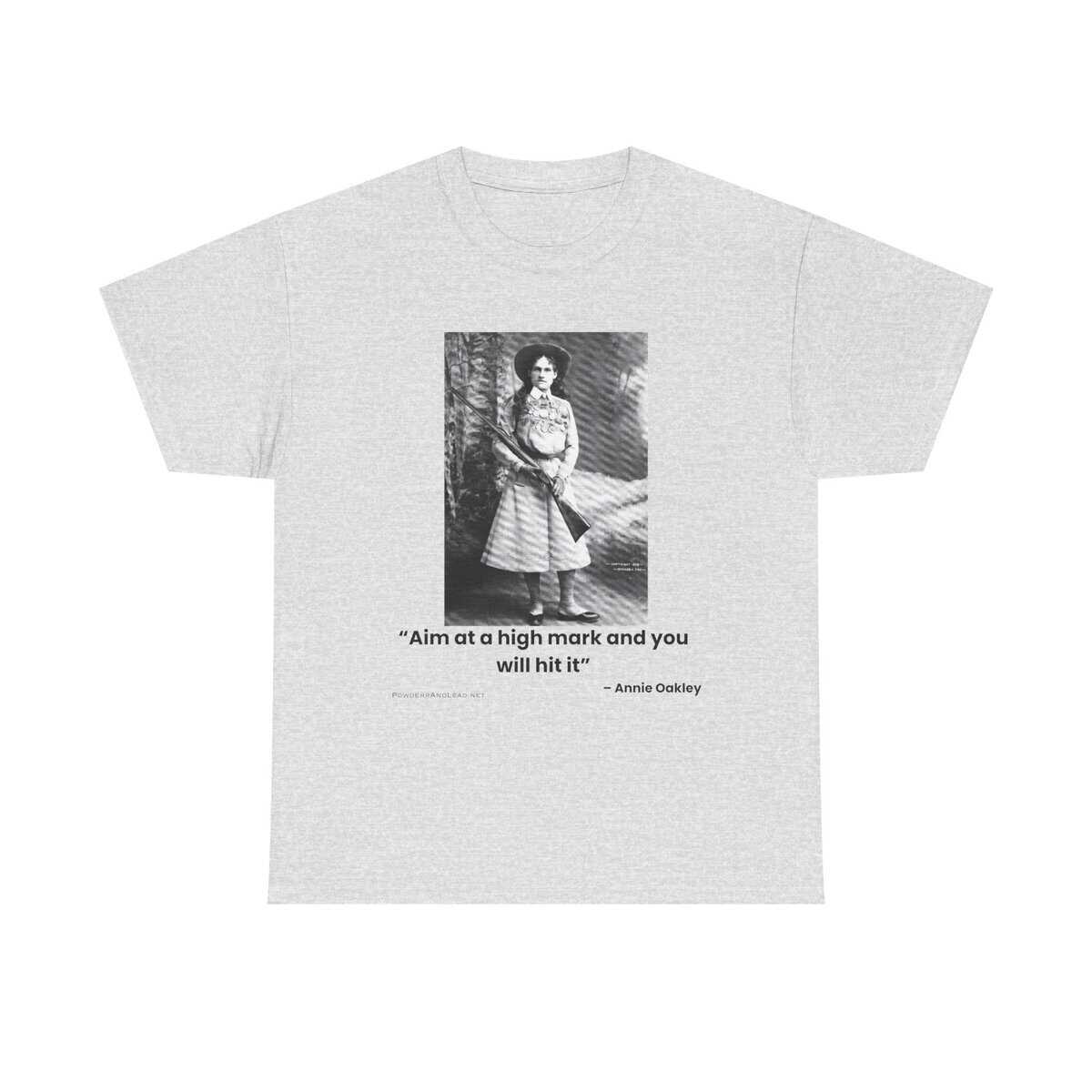 The “Aim at a High Mark” — Annie Oakley Tribute T-Shirt celebrates determination, precision, and timeless American grit. Featuring one of the most iconic images of Annie Oakley paired with her motivational quote, it’s more than apparel — it’s a call to excellence.