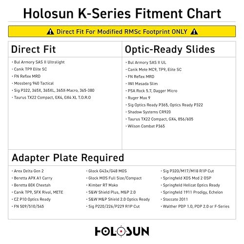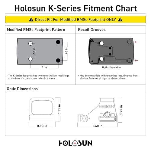 - HIGH PERFORMANCE – This reflex sight for handgun incorporates Lock Mode which locks the buttons preventing inadvertent setting changes when activated; The durable housing is made from 7075 Aluminum, uses Holosun's K footprint, and houses the 1632 battery in a side-mounted tray for easy replacement when needed