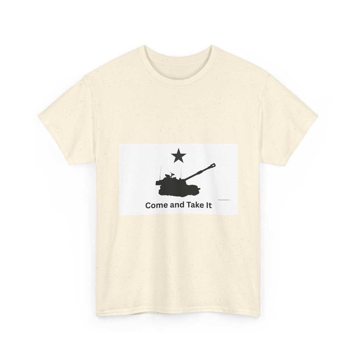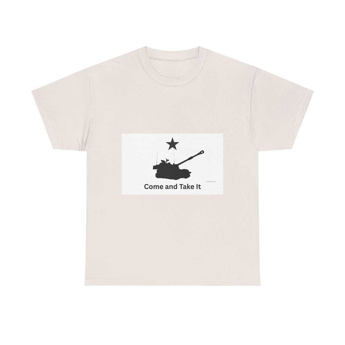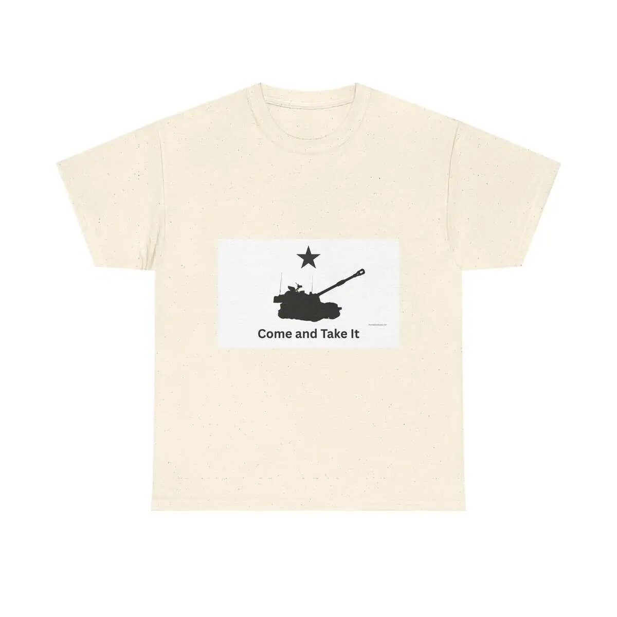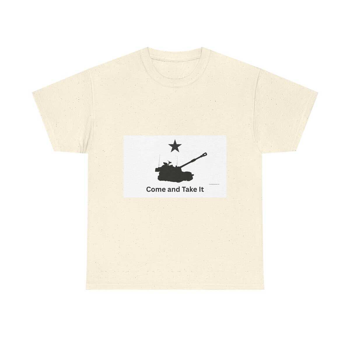 Inspired by the original Texas Revolution “Come and Take It” flag, this design reimagines the historic symbol for the modern age. The star remains — a mark of unity, independence, and courage. But beneath it stands a modern armored icon: the tank, silhouette sharp against the field, cannon forward in silent challenge.