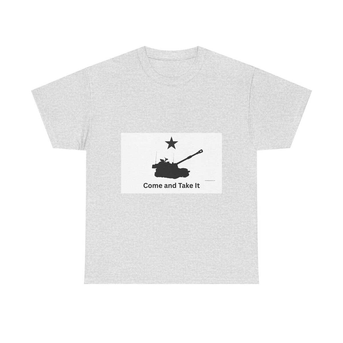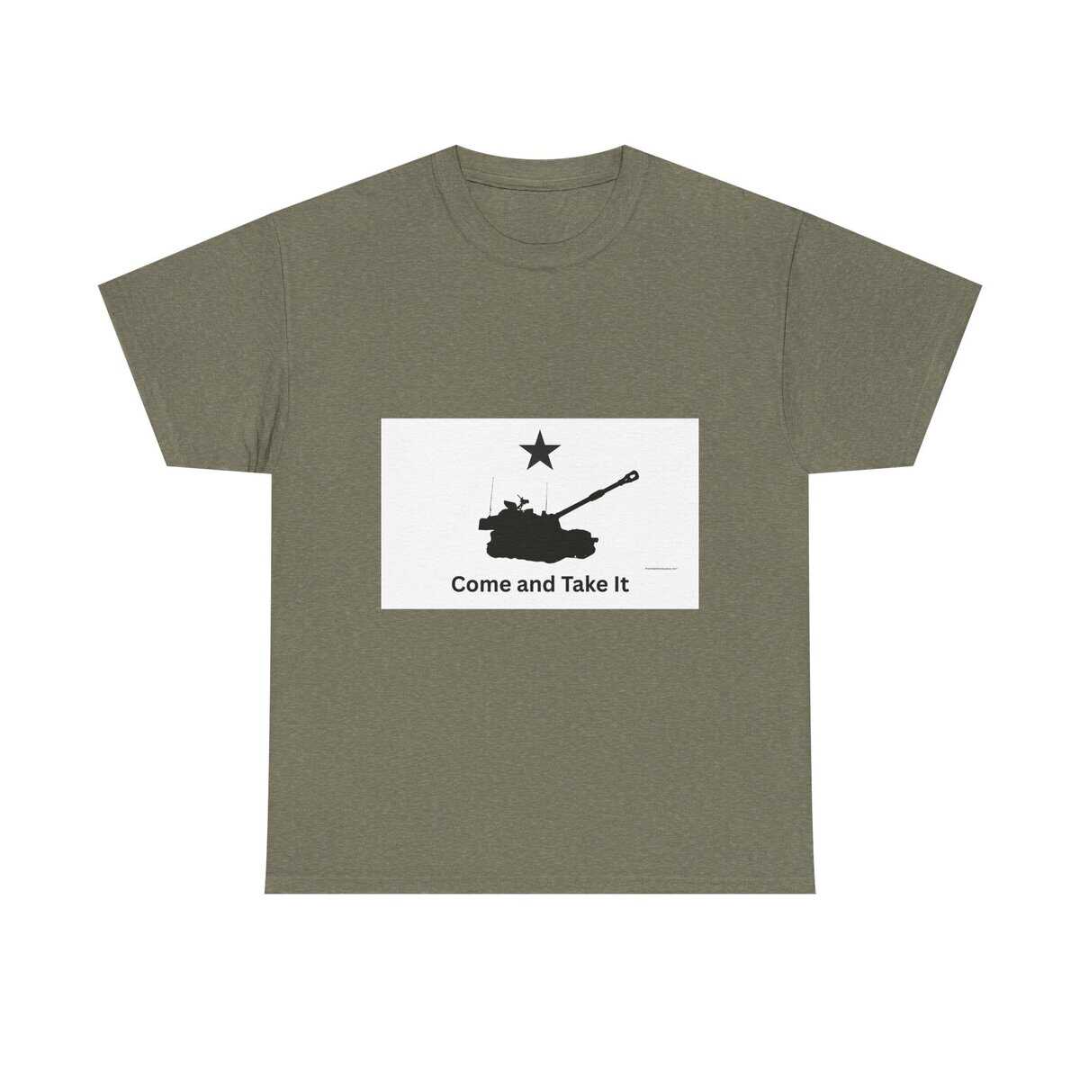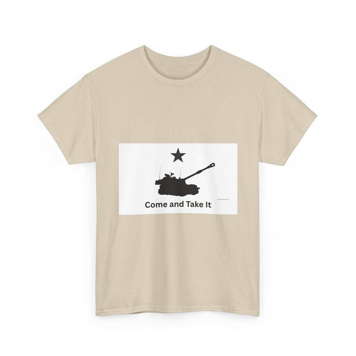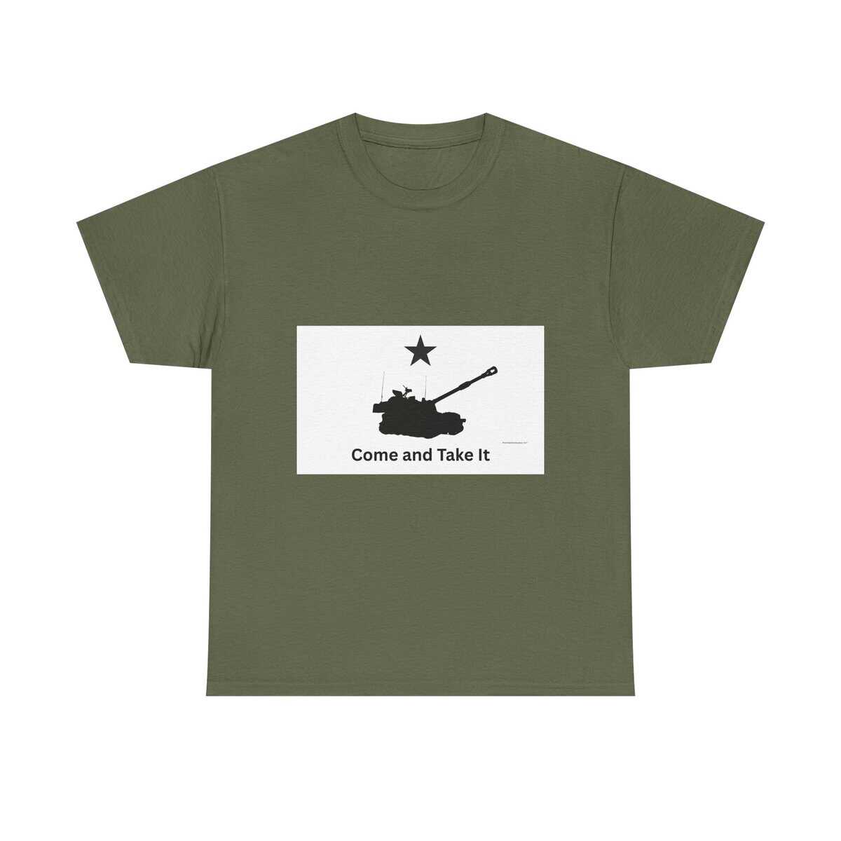 Inspired by the original Texas Revolution “Come and Take It” flag, this design reimagines the historic symbol for the modern age. The star remains — a mark of unity, independence, and courage. But beneath it stands a modern armored icon: the tank, silhouette sharp against the field, cannon forward in silent challenge.