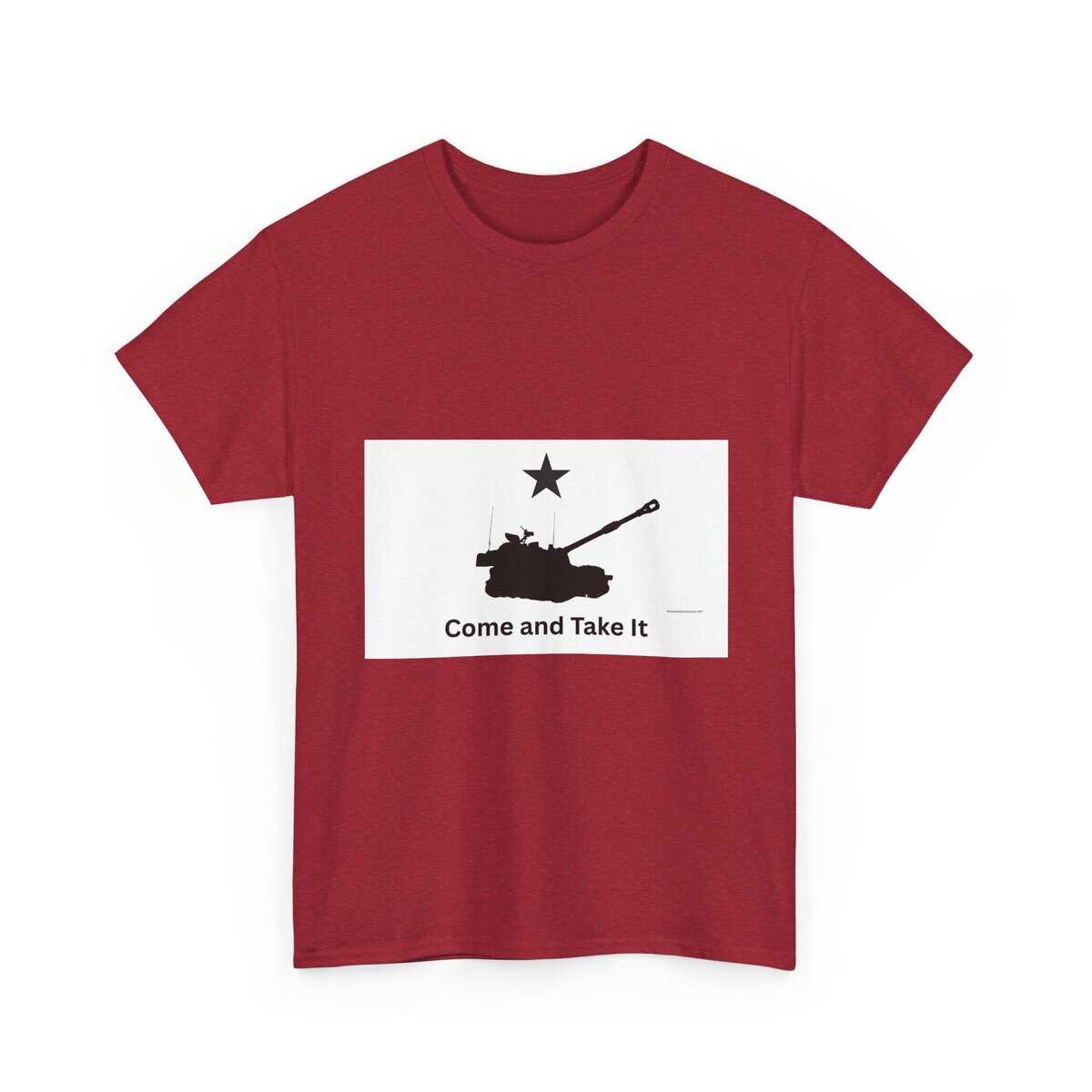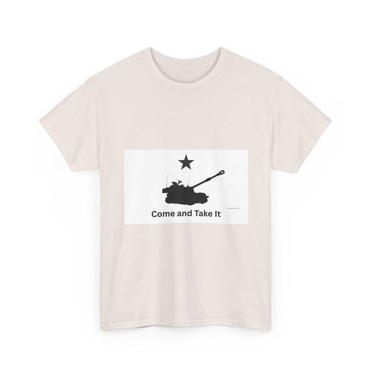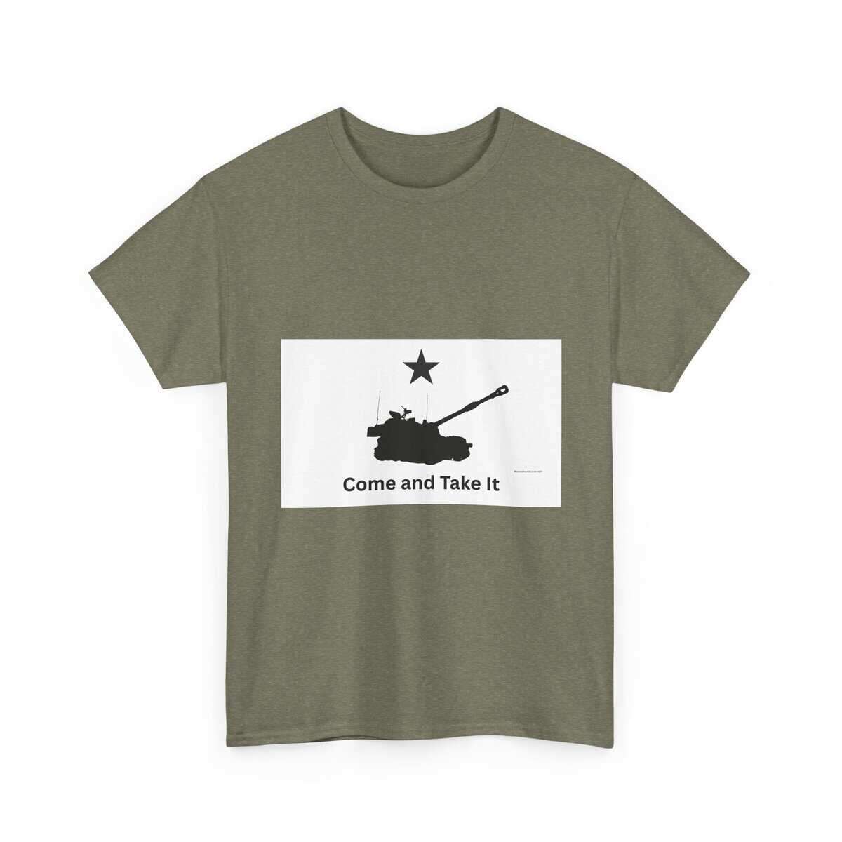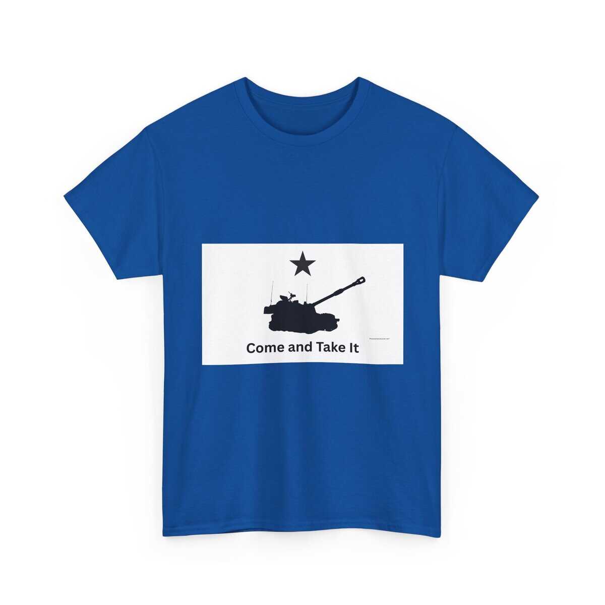 Inspired by the original Texas Revolution “Come and Take It” flag, this design reimagines the historic symbol for the modern age. The star remains — a mark of unity, independence, and courage. But beneath it stands a modern armored icon: the tank, silhouette sharp against the field, cannon forward in silent challenge.