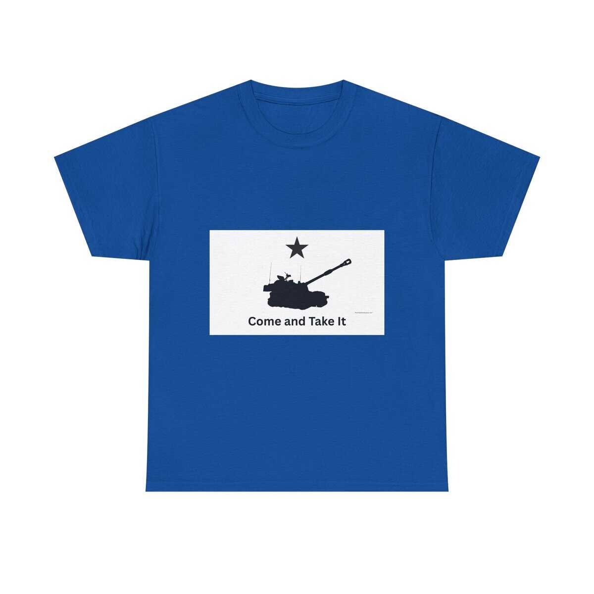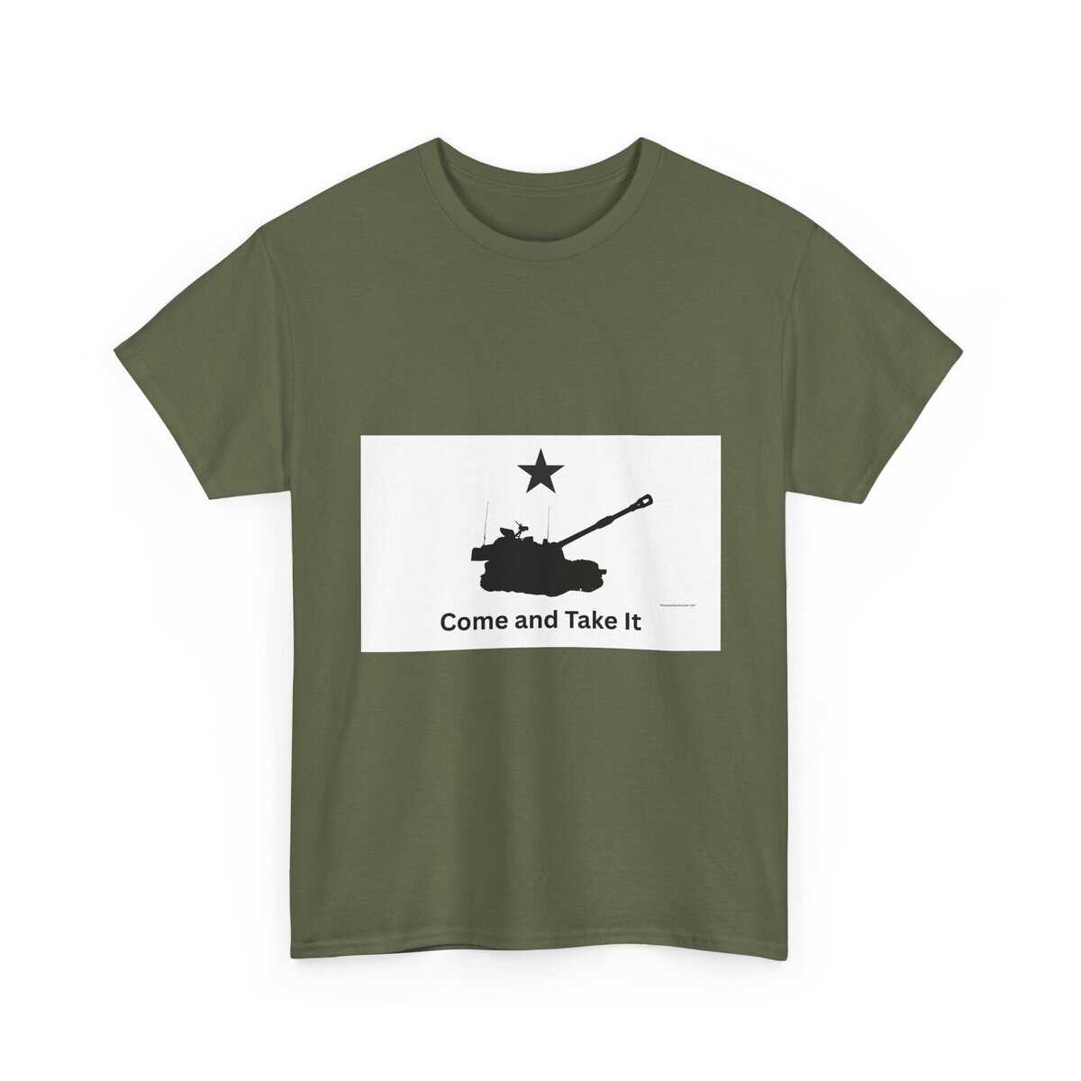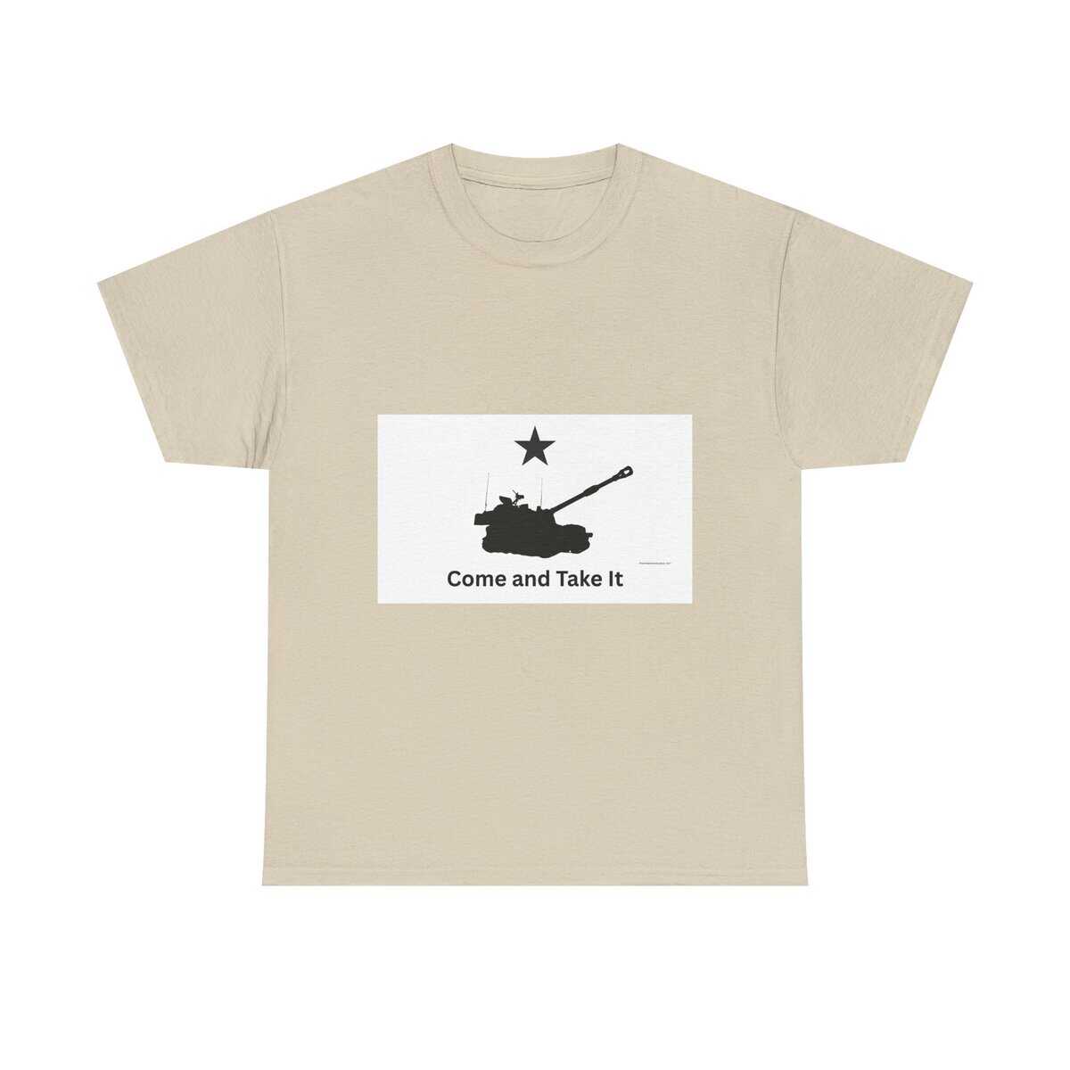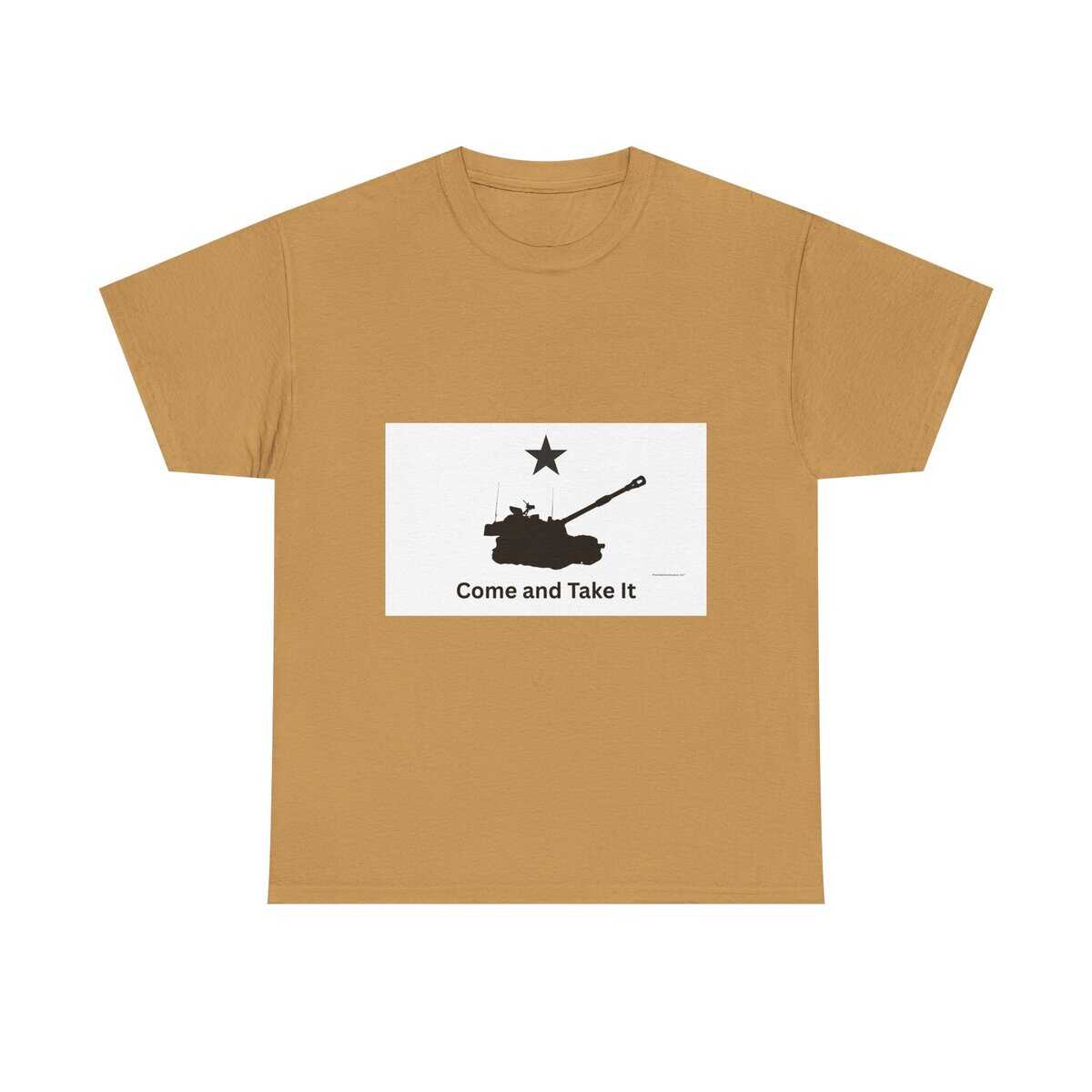 Inspired by the original Texas Revolution “Come and Take It” flag, this design reimagines the historic symbol for the modern age. The star remains — a mark of unity, independence, and courage. But beneath it stands a modern armored icon: the tank, silhouette sharp against the field, cannon forward in silent challenge.