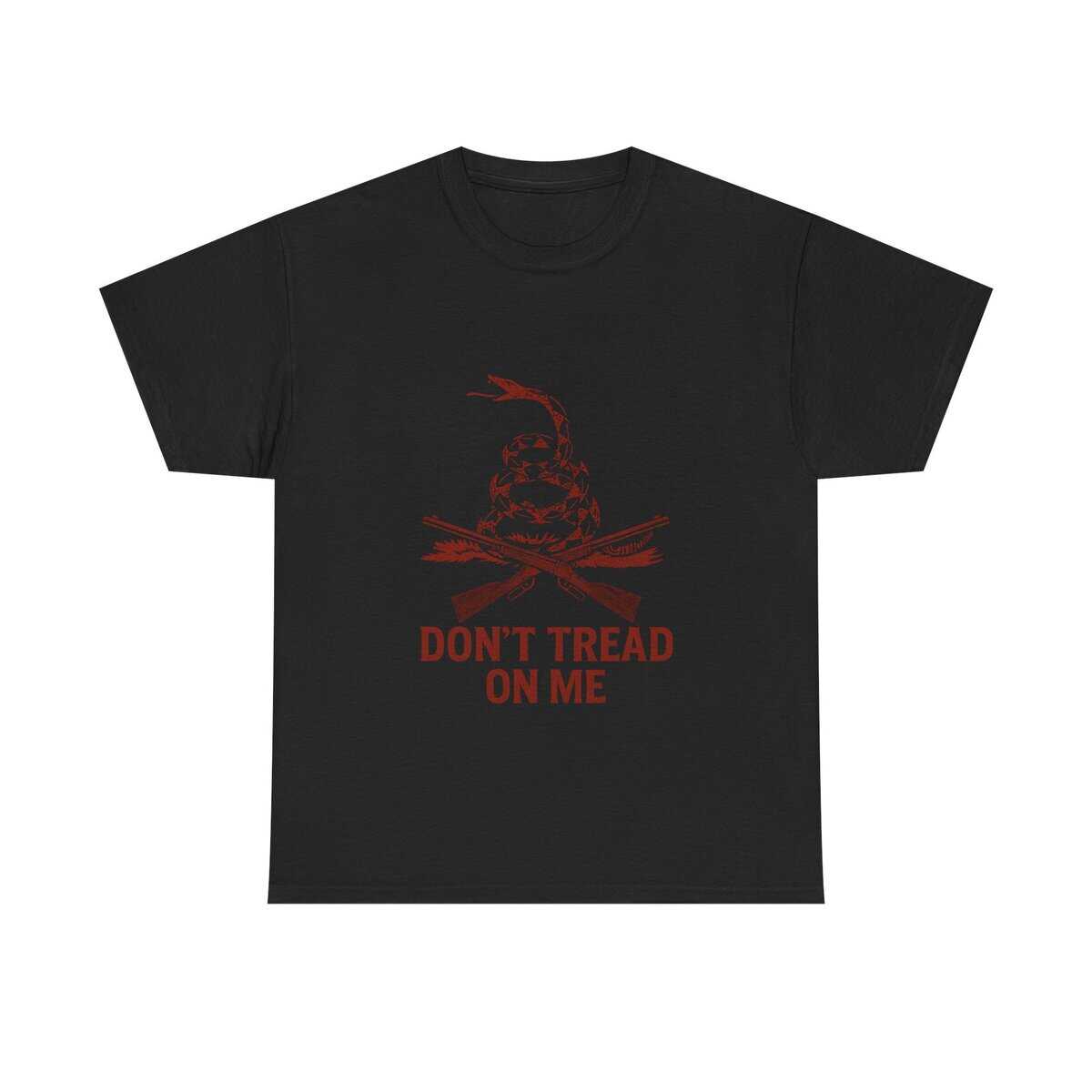 Printed in bold, distressed red on a black field, this shirt captures both the fury and pride of free men who refuse to be stepped on. The rattlesnake — alert, uncoiled, and ready — guards a pair of crossed rifles that represent the evolution of American strength: precision, craftsmanship, and a willingness to stand firm when tested.