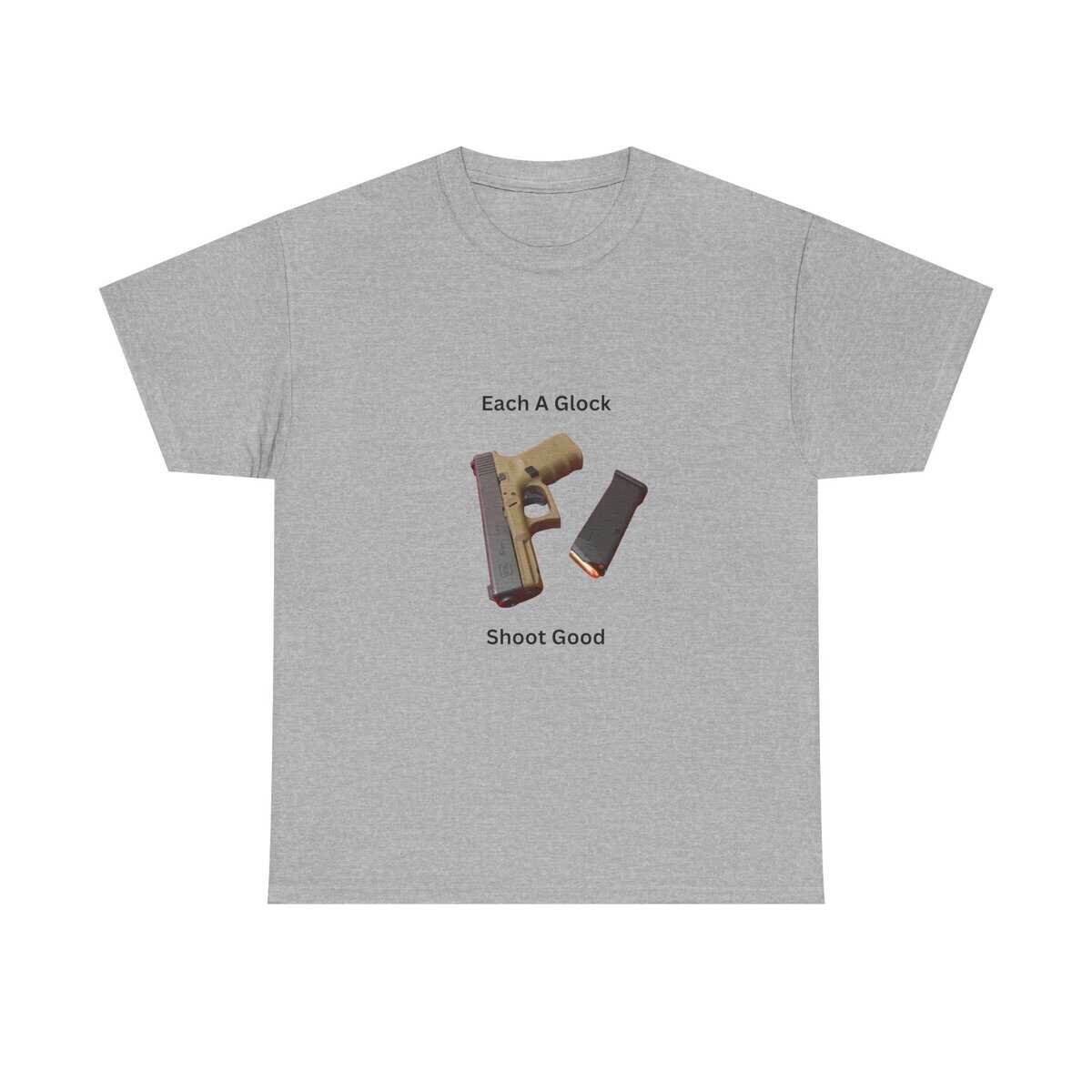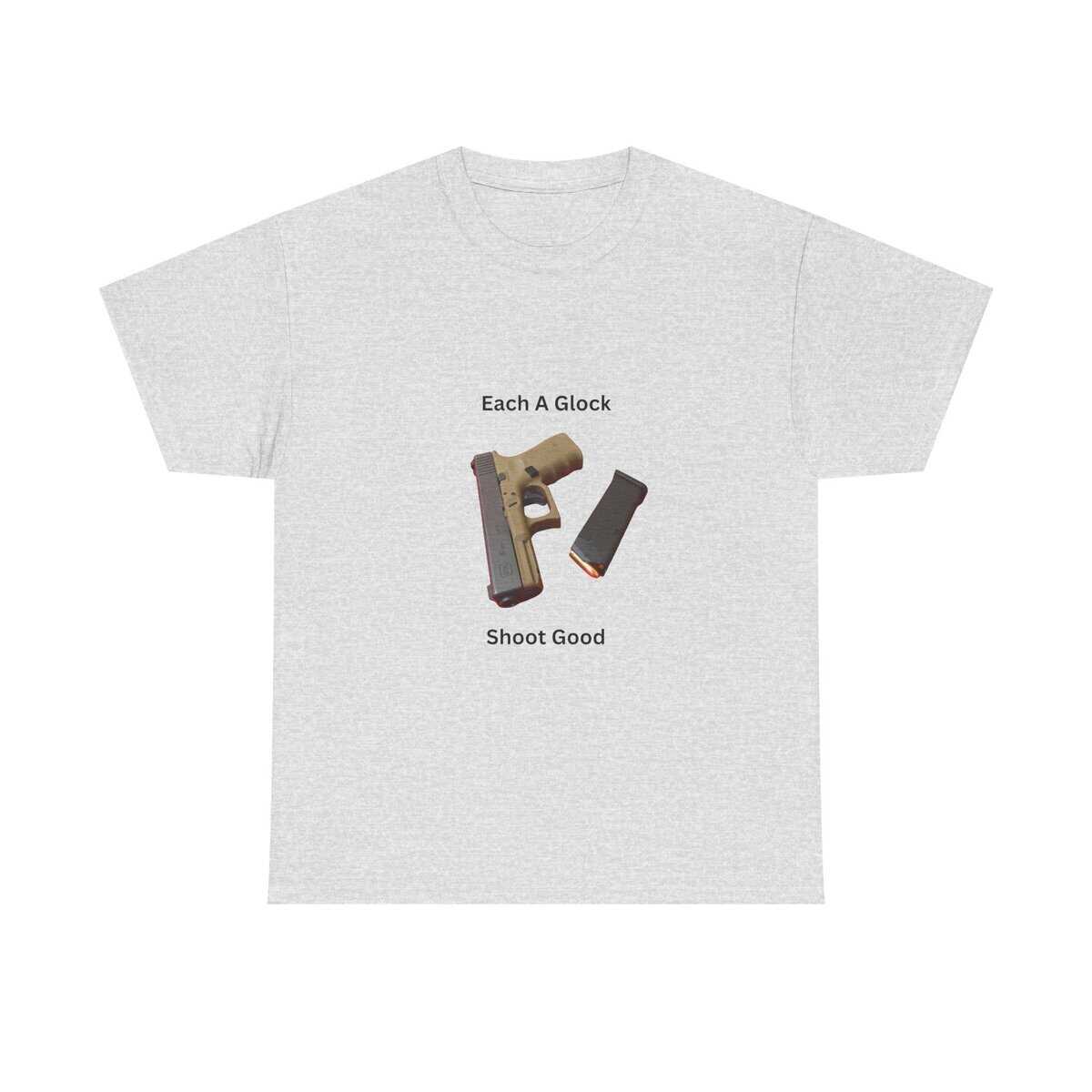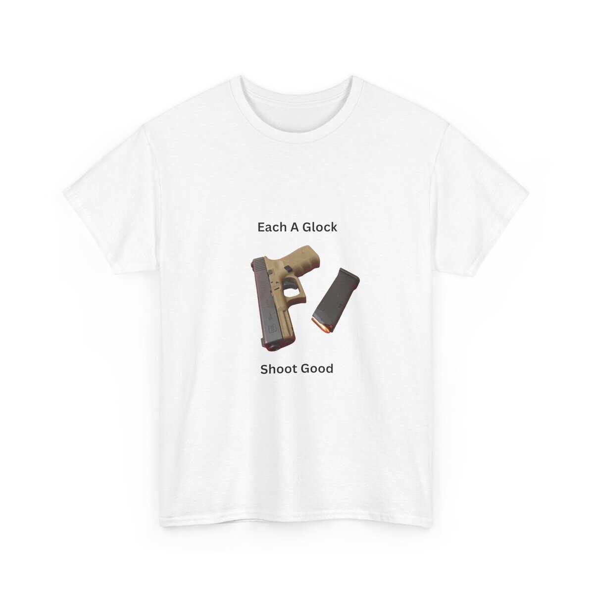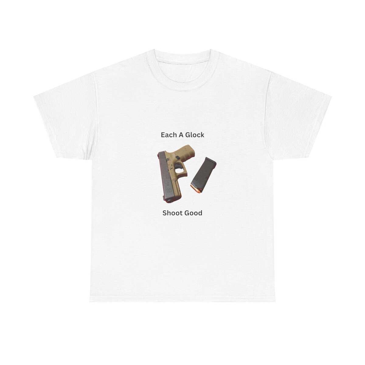 Design: Centered Glock pistol and magazine with text “Each A Glock / Shoot Good”