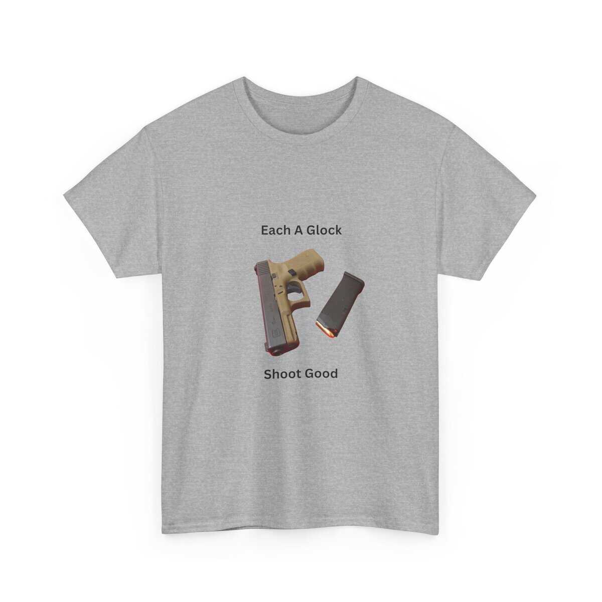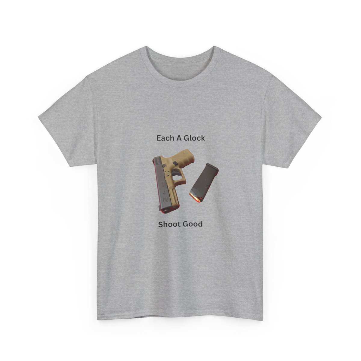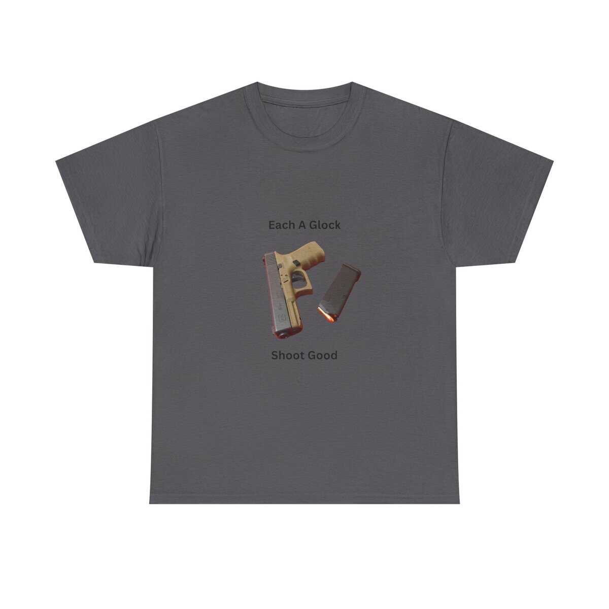 Design: Centered Glock pistol and magazine with text “Each A Glock / Shoot Good”