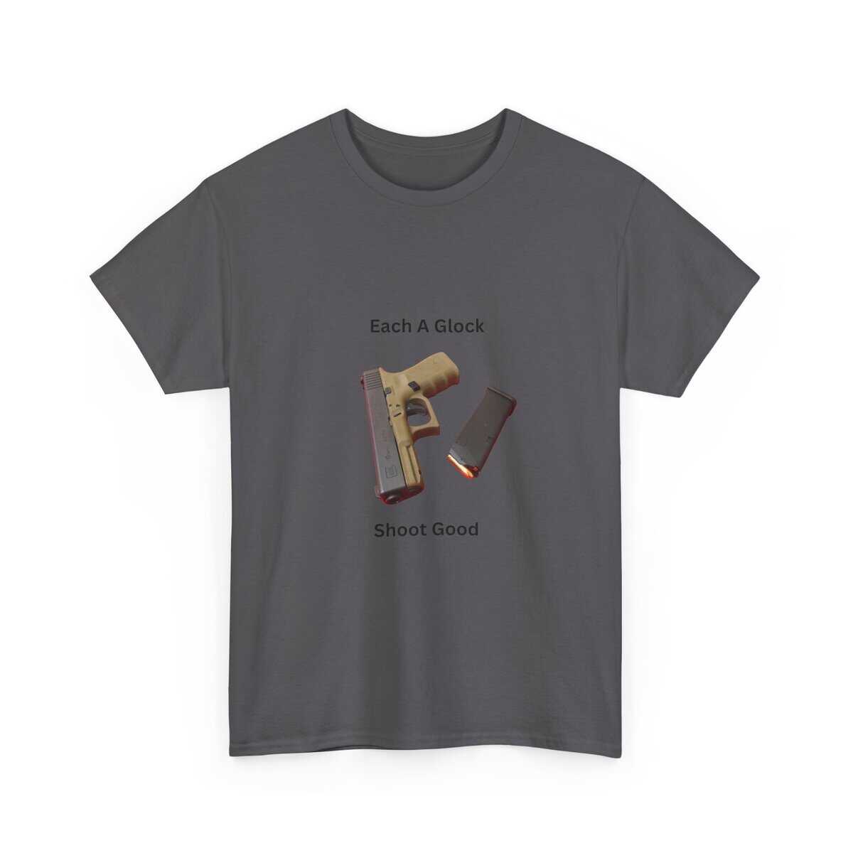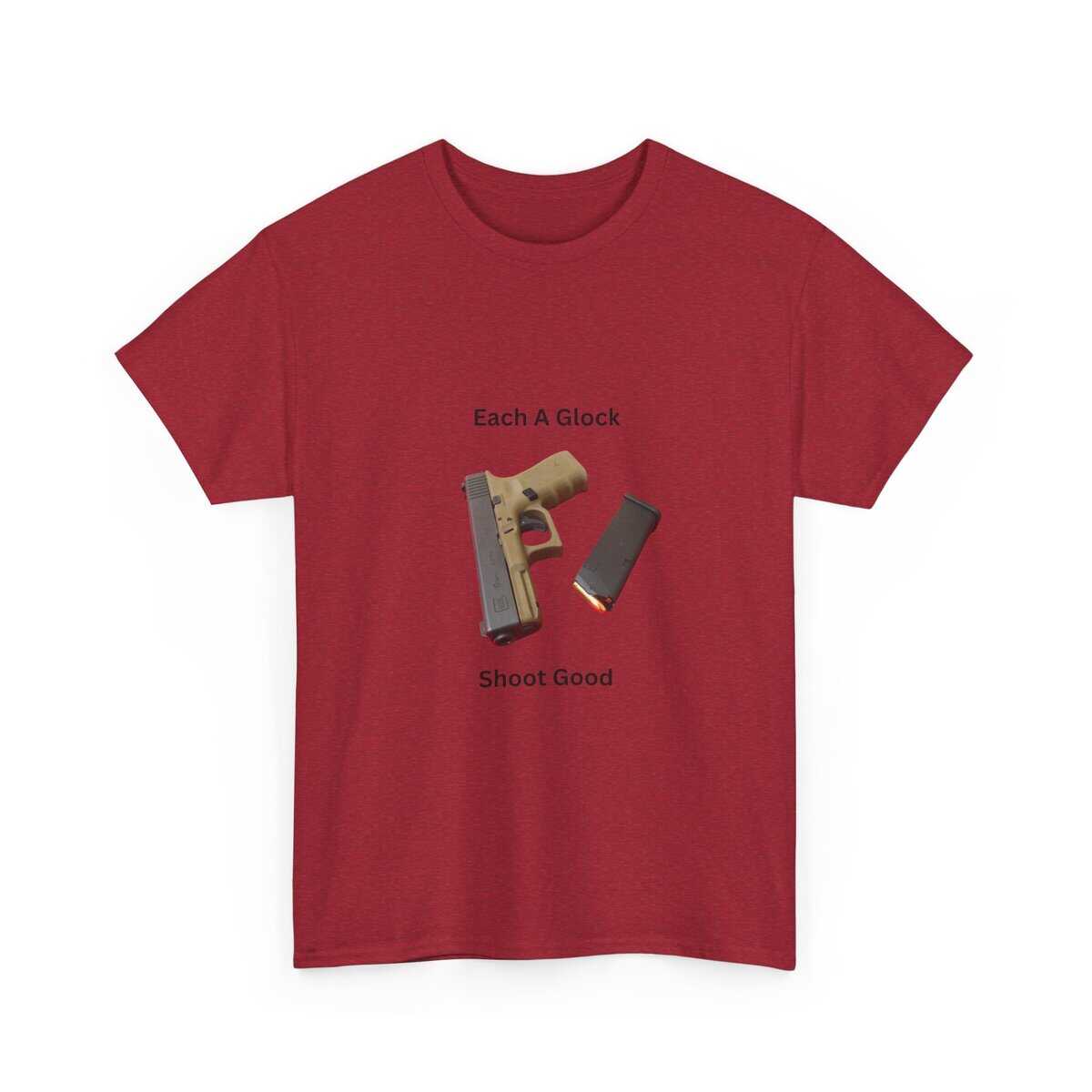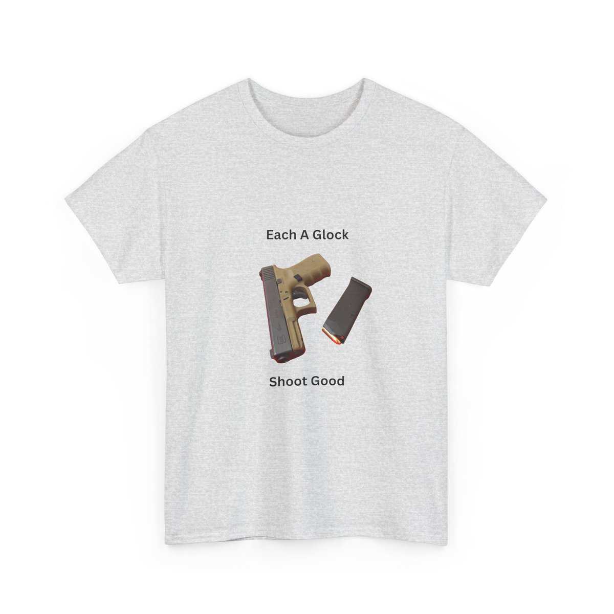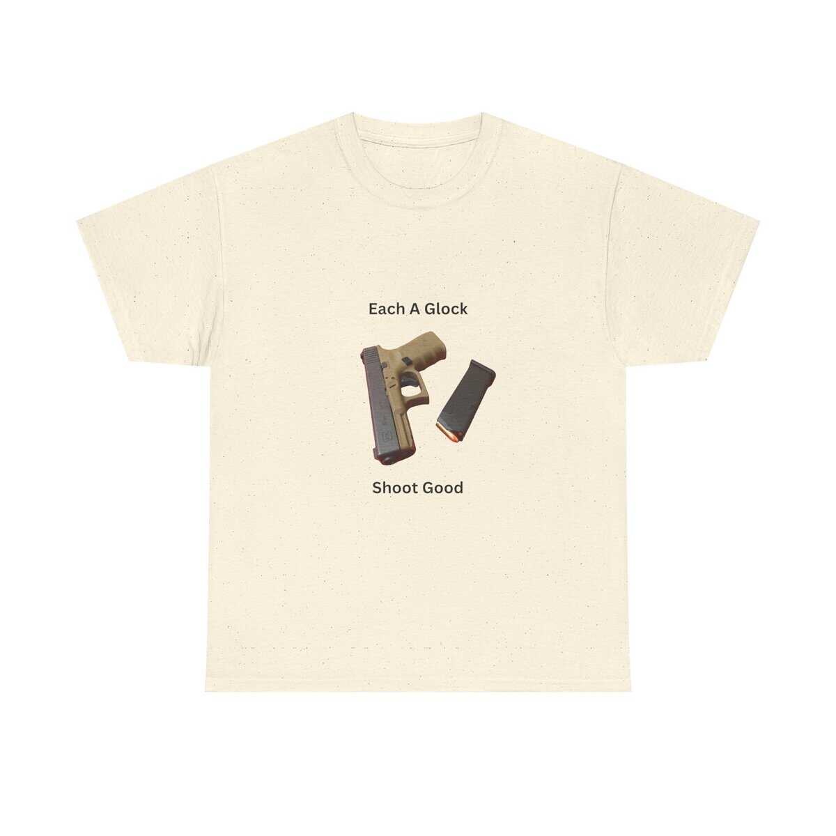 Design: Centered Glock pistol and magazine with text “Each A Glock / Shoot Good”