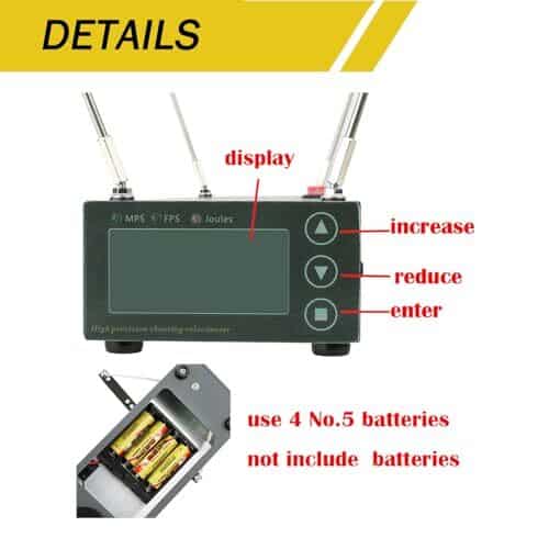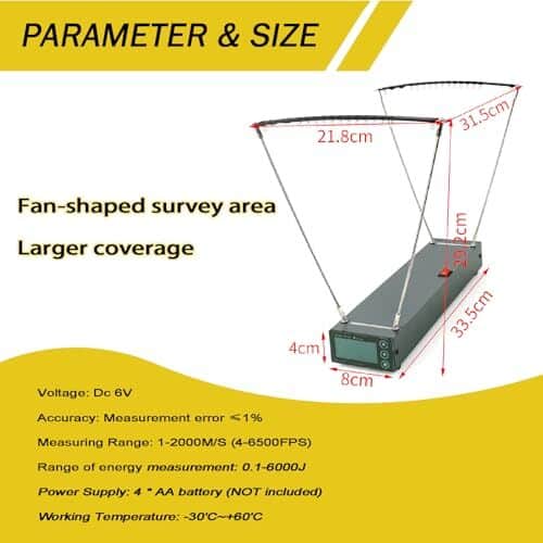 - Voltage: DC6 V; Battery(not included): 4 x AA battery(not included);Accuracy: test error ≤1%; Range of velocity measurement:4-6500 FPS; Range of energy measurement: 0.1-6000 J