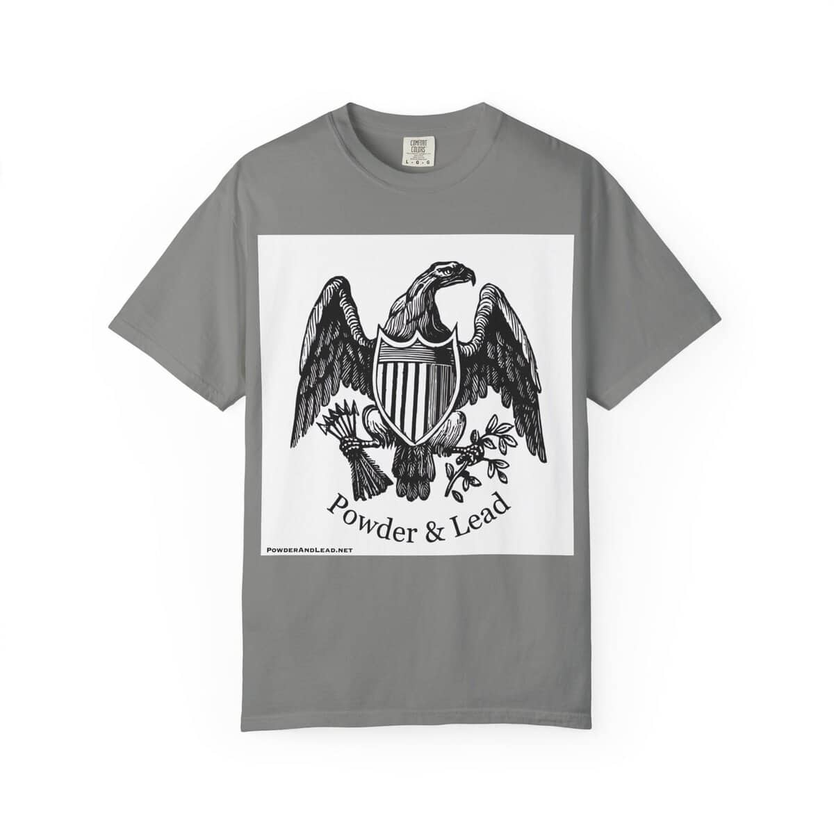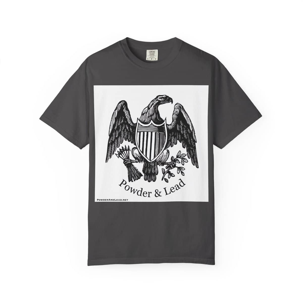 Front and center, the powerful eagle grips arrows and an olive branch, just as it has symbolized balance between might and mastery since the founding of the Republic. Beneath it, the words “Powder & Lead” declare your appreciation for history, precision, and self-reliant craftsmanship—values that never go out of style. The subtle PowderAndLead.net print at the hem grounds the design in authenticity, marking this as a true piece from the Powder & Lead Heritage Line.