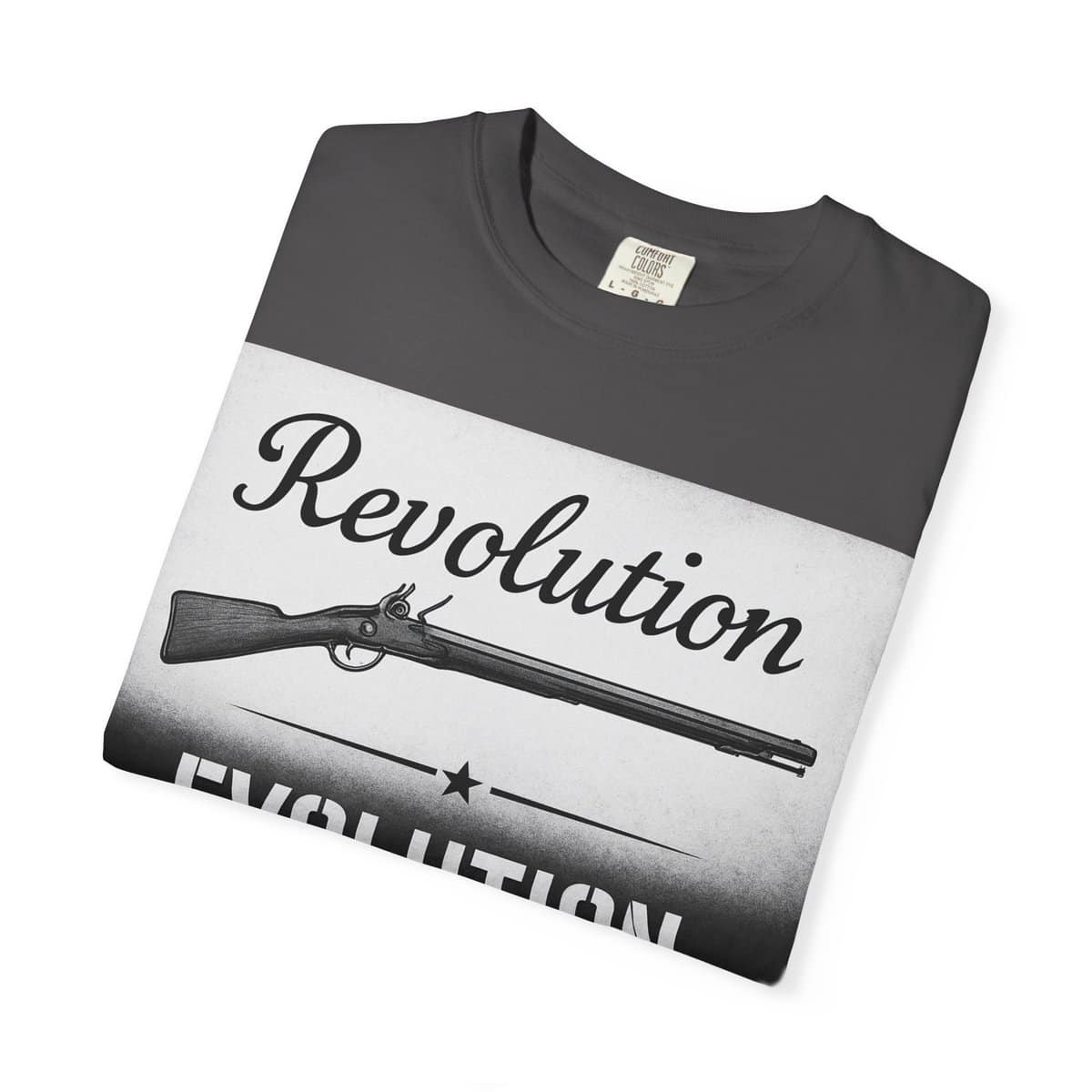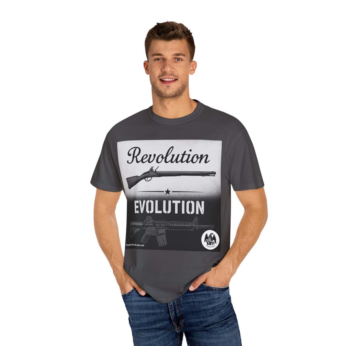 Show your love of firearms history and design with a shirt that says it all. This bold graphic tee features a striking two-panel design: at the top, the word “Revolution” paired with a classic flintlock rifle, symbolizing the firearms that helped forge a nation. Below, “Evolution” sits above the image of a modern AR-style rifle, representing the cutting edge of today’s firearm technology.