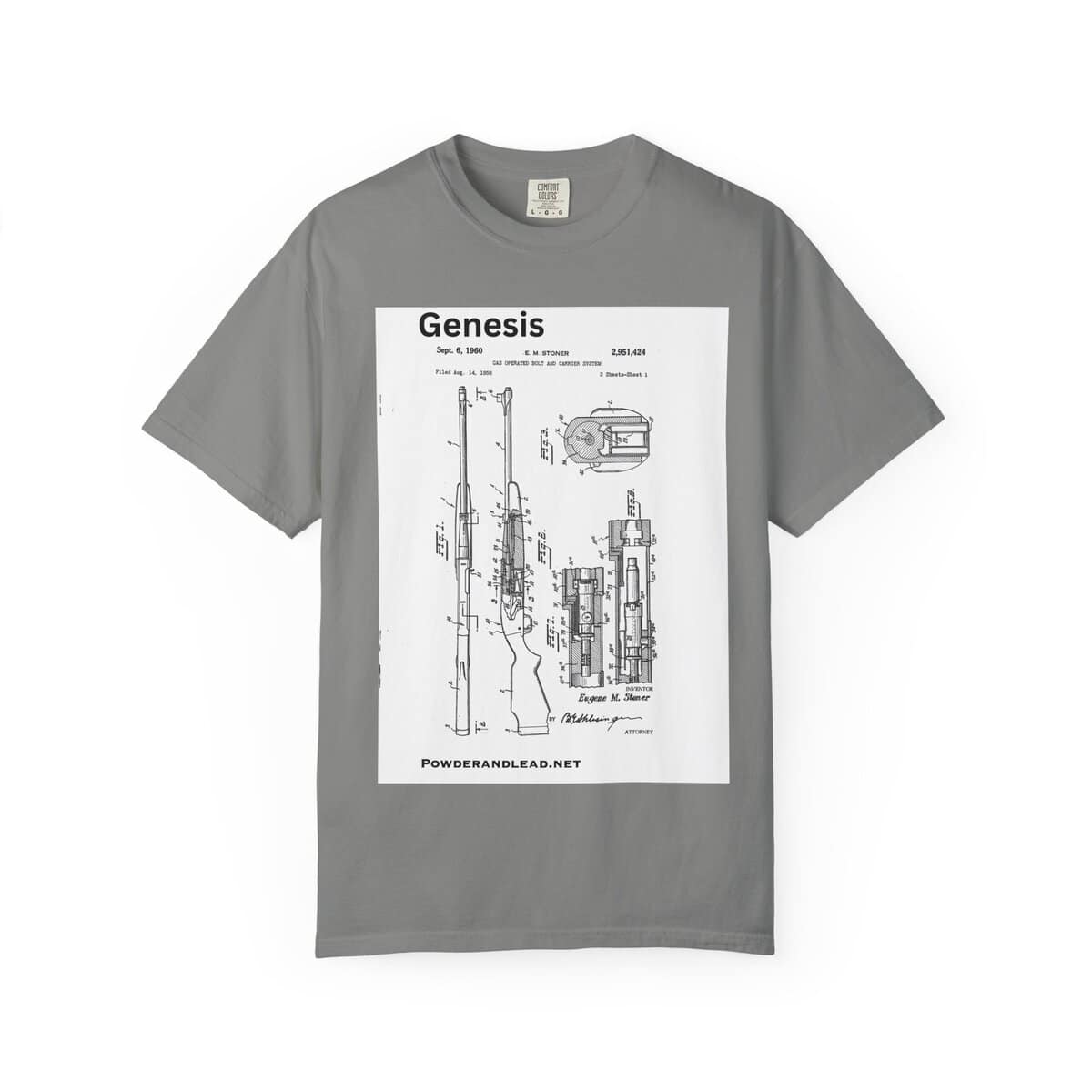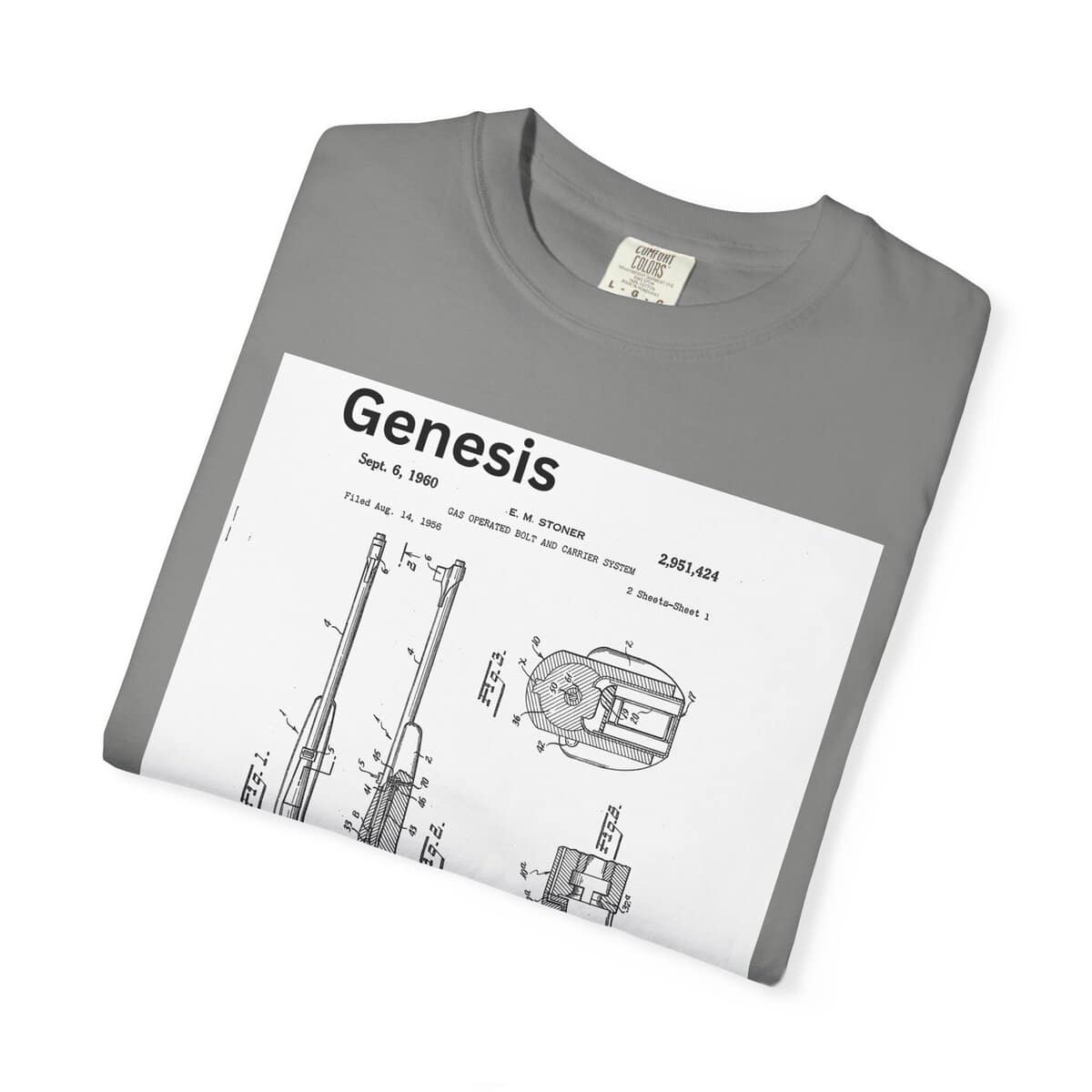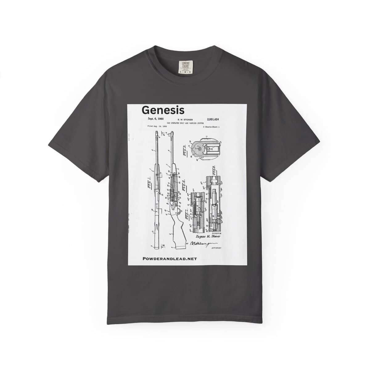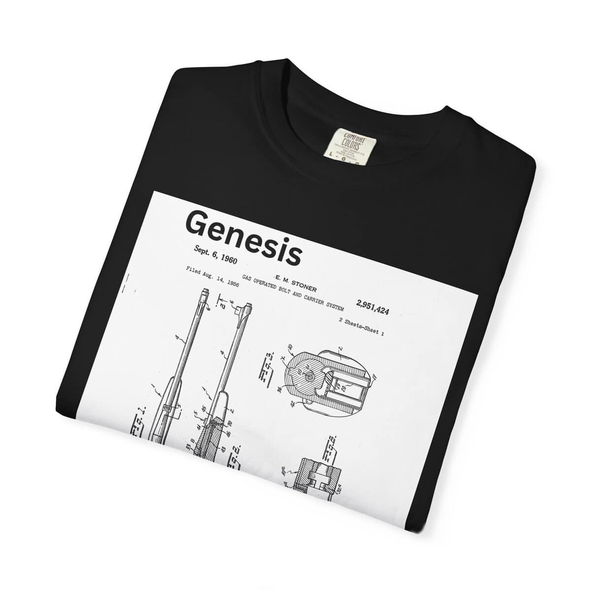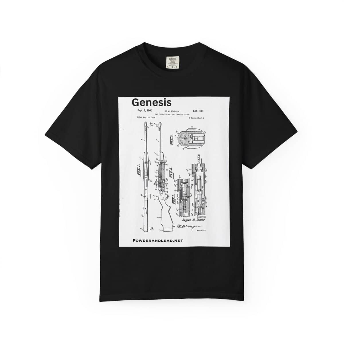 This Genesis shirt honors that moment — the mechanical spark that ignited a revolution in firearm design. Every rifle enthusiast owes a nod to Stoner’s blueprint. This design puts that genius front and center, in the same clean technical style as the original patent submission.
